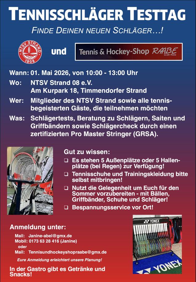 Die Tennisabteilung testet neue Ausrüstung! Kommt vorbei und probiert das neueste Equipment aus deckt Euch mit Bällen, Griffbänder usw. für die Sommersaison ein.